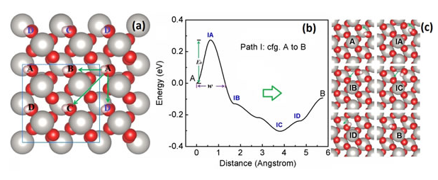 圖1. (a) 氫原子在β-PtO2(001)面擴(kuò)散示意圖;(b) 從位型A擴(kuò)散至位型B的最優(yōu)能量路徑; (c) 從位型A擴(kuò)散至位型B對應(yīng)的一些中間吸附態(tài)。