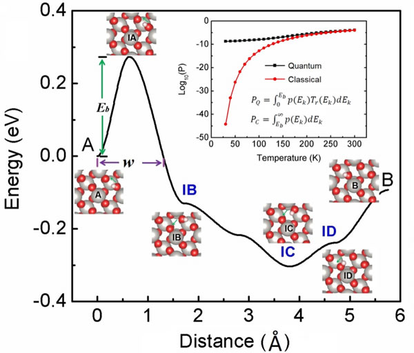 接下來,基于量子力學(xué)的Wentzel–Kramers–Brillouin (WKB) 近似以及統(tǒng)計(jì)力學(xué)關(guān)于粒子動能分布的最新成果,楊勇給出了在特定溫度下單粒子穿越勢壘的經(jīng)典和量子概率的解析表達(dá)式。與研究核量子效應(yīng)常用的理論工具——路徑積分分子動力學(xué) (path integral molecular dynamics) 相比,這一新方法的優(yōu)勢在于:在保證合理精度的前提下,可以用相對小得多的計(jì)算量對表面及體態(tài)等大尺度原子分子體系中的核量子效應(yīng)做研究。把這一方法運(yùn)用到氫原子在beta-PtO2(001)面的擴(kuò)散過程,可以計(jì)算出氫原子穿越給定勢壘的經(jīng)典概率(PC)和量子概率(PQ)。如圖2所示,在室溫 (~ 300 K) 條件下,量子概率和經(jīng)典概率的幅度不相上下,不可忽略;而在低溫下,量子概率遠(yuǎn)大于經(jīng)典概率,占據(jù)著絕對主導(dǎo)的地位。