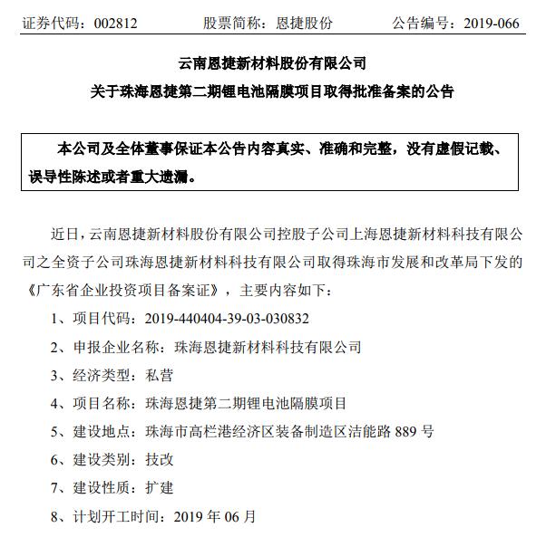 6月12日,恩捷股份發(fā)布公告稱,全資子公司珠海恩捷第二期鋰電池隔膜項(xiàng)目取得珠海市發(fā)展和改革局下發(fā)的 《廣東省企業(yè)投資項(xiàng)目備案證》。