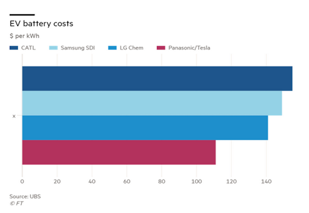 一個最具說服力的數(shù)據(jù)是2018年11月瑞士聯(lián)合銀行(UBS)對松下、LG化學(xué)、三星SDI和寧德時代的電池進行測試評估,其中特斯拉超級工廠生產(chǎn)的松下電池成本是0.11美元/瓦時(約合人民幣0.76元/瓦時),遠低于其他三家競爭對手,其中寧德時代的電池成本約0.15美元/瓦時(約合人民幣1.03元/瓦時),在四家企業(yè)中成本最高。