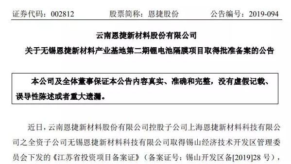 7月19日,恩捷股份發(fā)布了《關(guān)于無錫恩捷新材料產(chǎn)業(yè)基地第二期鋰電池隔膜項目取得批準備案的公告》。