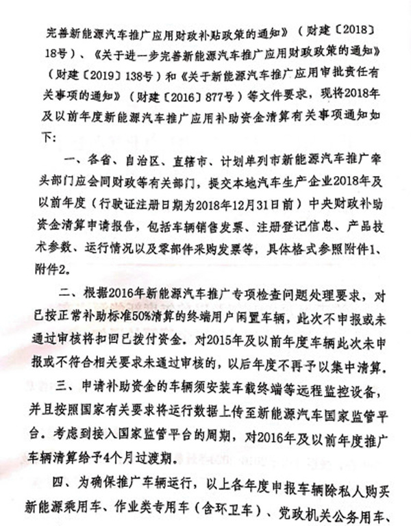 新能源汽車補(bǔ)助資金申報(bào)材料上報(bào)截止日期為2019年9月30日(2016年及以前年度推廣車輛延長到2020年1月31日),逾期未報(bào)或報(bào)送內(nèi)容不符合要求的,將延期清算。