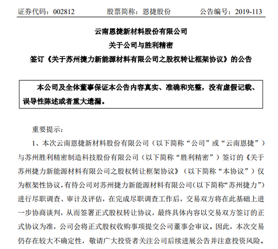 8月4日晚間,恩捷股份(002812)發(fā)布公告,公司與勝利精密(002426)簽訂了框架協(xié)議,擬以自有資金收購勝利精密所持有的蘇州捷力100%股權(quán)。