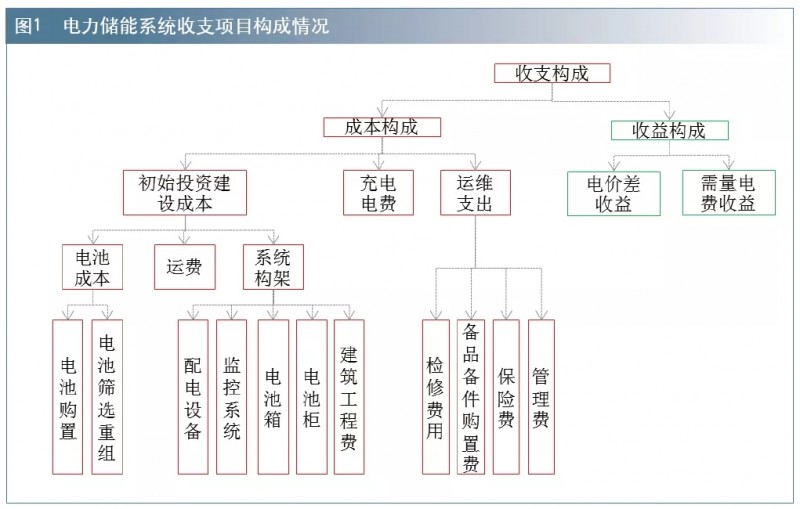 (二)本次研究投資回報周期測算基礎(chǔ)模型。初始投資建設(shè)成本(設(shè)為C)有以下3方面構(gòu)成:電池成本(設(shè)為C電池)、運輸成本(設(shè)為C運輸)、系統(tǒng)構(gòu)架成本(設(shè)為C構(gòu)架)。系統(tǒng)運營成本有以下2方面構(gòu)成:充電電費支出(設(shè)為C充電)和系統(tǒng)運維成本(設(shè)為C運維)。收益來源可包含2方面:削峰填谷下的電價差收益(設(shè)為P電價差)和需量電費收益(設(shè)為P需量)。綜上,投資回報周期(設(shè)為T)測算模型為C電池+C運輸+C構(gòu)架+C運維×T=(P電價差+P需量)×T。本次研究在投資回報周期內(nèi),對系統(tǒng)設(shè)備折舊不作考慮,儲能用電池更換費用計入運維成本支出中,詳細(xì)成本和收益項目構(gòu)成如圖1所示。