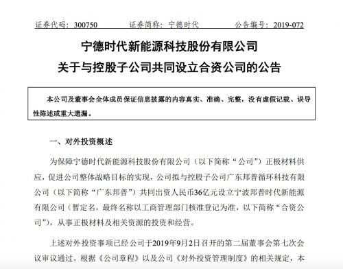 9月3日消息,寧德時(shí)代發(fā)布公告稱,公司擬與控股子公司廣東邦普循環(huán)科技有限公司(以下簡(jiǎn)稱“廣東邦普”)共同出資人民幣36億元設(shè)立寧波邦普時(shí)代新能源有限公司,從事正極材料及相關(guān)資源的投資和經(jīng)營。