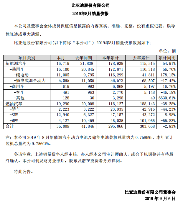 今年8月比亞迪乘用車銷量為35390輛。其中,新能源汽車8月銷量16100輛,燃油汽車銷量為19290輛;1-8月,比亞迪乘用車累計銷量288998輛,同比微降3.3%。其中,新能源車1-8月累計銷量172871輛,同比增長56.7%,燃油汽車累計銷量為11.61萬輛,同比下滑38.28%。
