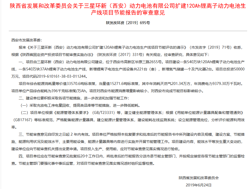 值得關(guān)注的還有另一則消息,2019年6月24日,陜西省發(fā)展和改革委員會(huì)官網(wǎng)發(fā)布了一則“關(guān)于三星環(huán)新(西安)動(dòng)力電池有限公司擴(kuò)建120Ah鋰離子動(dòng)力電池生產(chǎn)線項(xiàng)目節(jié)能報(bào)告的審查意見”的信息。信息顯示,該項(xiàng)目由三星環(huán)新建設(shè),將建設(shè)一條540萬塊120Ah鋰離子動(dòng)力電池生產(chǎn)線(約2.4GWH),一條540萬塊37Ah鋰離子動(dòng)力電池生產(chǎn)線(約0.8GWH),新增鋰離子電池生產(chǎn)線設(shè)備共221臺(tái)(套),新增氮?dú)鈨?chǔ)罐一個(gè)及汽化器2臺(tái),該項(xiàng)目總投資5億元。這表明三星SDI在華動(dòng)力業(yè)務(wù)布局加快,并且正在大幅擴(kuò)充產(chǎn)能。