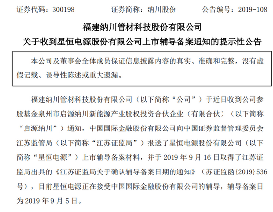 9月16日晚間,納川股份(300198)公告,公司于近日收到公司參股基金泉州市啟源納川新能源產(chǎn)業(yè)股權(quán)投資合伙企業(yè)(有限合伙)(“啟源納川”)通知,中國國際金融股份有限公司向中國證券監(jiān)督管理委員會江蘇監(jiān)管局(“江蘇證監(jiān)局”)報送了星恒電源股份有限公司(“星恒電源”)上市輔導備案材料,并于2019年9月16日取得了江蘇證監(jiān)局出具的《江蘇證監(jiān)局關(guān)于確認輔導備案日期的通知》(蘇證監(jiān)函{2019}536號),目前星恒電源正在接受中國國際金融股份有限公司的輔導,輔導備案日為2019年9月5日。