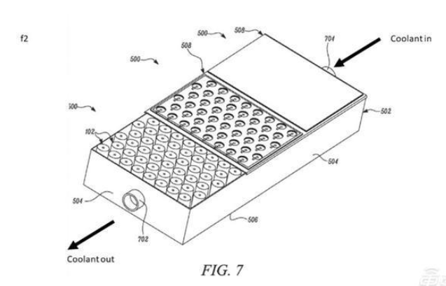 在特斯拉的專利圖片中可以看到,特斯拉為電池組設(shè)計了兩個開口,液體可以流入和流出,能夠直接利用液體從電池組中經(jīng)過來降低電池溫度。