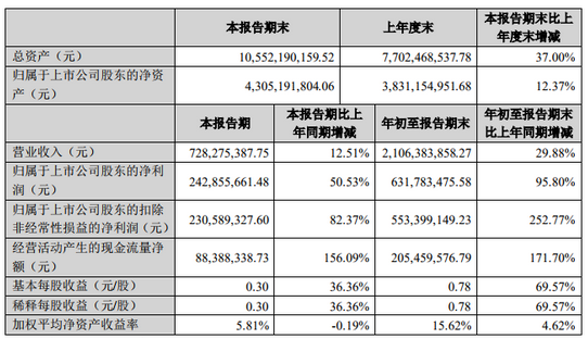 另外,前三季度,實現(xiàn)營業(yè)收入21.06億元,同比增長29.88%;歸屬于上市公司股東的凈利潤6.32億元,同比增長95.80%;歸屬于上市公司股東的扣除非經(jīng)常性損益的凈利潤5.53億元,同比增長252.77%;基本每股收益0.78元。