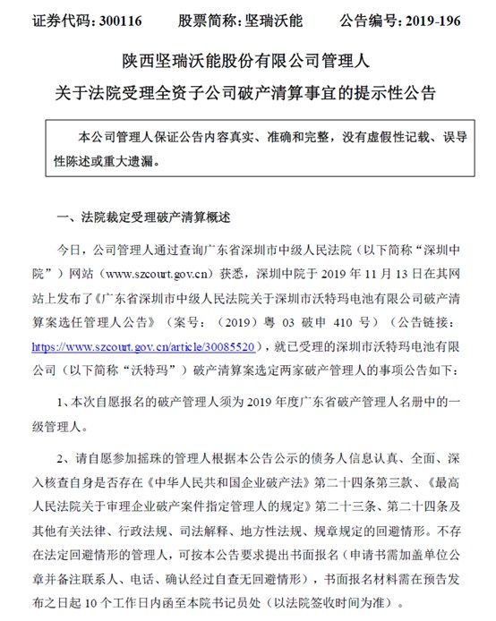 11月13日晚間,堅瑞沃能發(fā)布公告稱,深圳市中級人民法院于 2019 年 11 月 7 日裁定受理黃子廷申請深圳市沃特瑪電池有限公司破產(chǎn)清算一案。