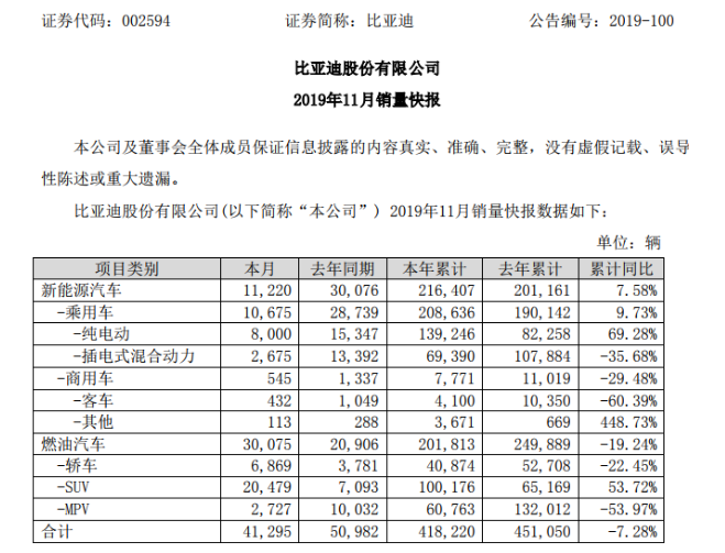 12月6日晚間,比亞迪(002594)發(fā)布11月銷量快報顯示,今年11月,比亞迪銷售4.1萬輛汽車,同比下滑19%。銷量下滑主要是由于比亞迪新能源汽車銷量不及預(yù)期。