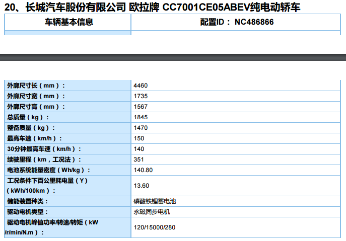 根據新能源汽車推廣目錄11月份信息,長城歐拉iQ換裝磷酸鐵鋰,工況法續(xù)航里程從421公里降至351公里,系統(tǒng)能量密度140.8wh/kg,百公里耗電13.6度。