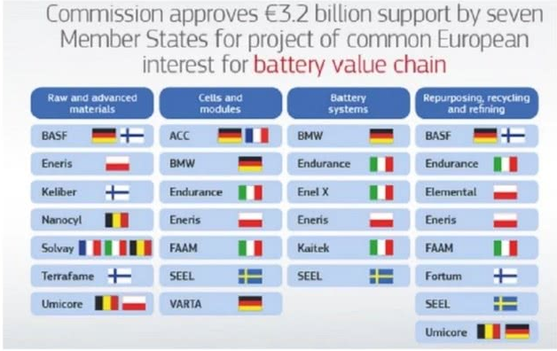 歐盟委員會表示,歐盟認(rèn)為電動汽車電池制造業(yè)對歐洲具有戰(zhàn)略意義。為此,歐盟共批準(zhǔn)32億歐元(249億元人民幣)支持德國、法國、意大利、比利時、芬蘭、波蘭和瑞典七個歐盟國家的電動汽車電池技術(shù)研發(fā)和生產(chǎn)項目。