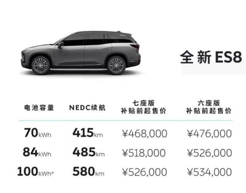動力方面,全新ES8搭載160千瓦永磁電機與240千瓦感應(yīng)電機智能四驅(qū)系統(tǒng),最大功率達到544馬力,最大扭矩達到725牛·米。此外,全新ES8在搭載100千瓦時液冷恒溫電池包的情況下,NEDC續(xù)航可達580公里,接近600公里。