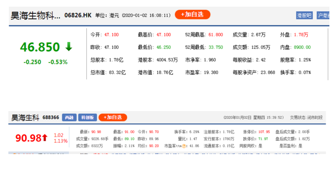 在這一對(duì)比下,昊海生物科技(06826,HK)算是走在了前面。2019年10月底,昊海生科(688366,SH)成功分拆上市,發(fā)行價(jià)89.23元/股。1月2日昊海生科股價(jià)為90.98元/股,但即使這樣,昊海生科的股價(jià)也比在港股時(shí)的46.7港元/股高出一半多。
