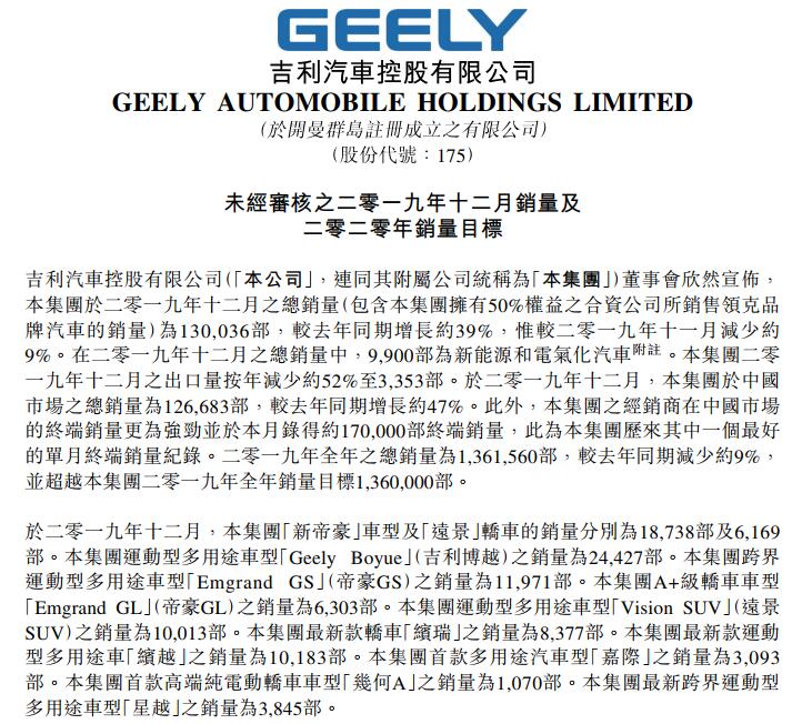 整體來看,吉利汽車12月銷量13萬輛,同比增長39.3%;2019年累計(jì)銷量136.16萬輛,超額完成全年136萬輛銷量目標(biāo)。