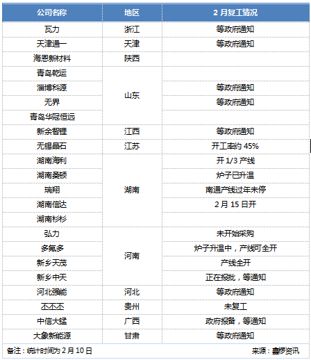 在經(jīng)歷了超長的春假假期后,2月10日全國大多數(shù)地區(qū)開始復(fù)工復(fù)產(chǎn)。10日,鑫欏資訊對錳酸鋰行業(yè)進行跟蹤了解,統(tǒng)計22家樣本企業(yè)產(chǎn)能超過95%,截止2月10日,錳酸鋰企業(yè)開工率不足10%,僅無錫晶石、新鄉(xiāng)天茂、湖南海利、桑頓新能源、瑞翔產(chǎn)線已開,中信大錳等其他大多數(shù)企業(yè)正在等政府通知,具體復(fù)工時間有待進一步確定。