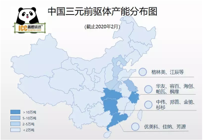 國內三元前驅體行業(yè)的地域化集中度非常高,有半數以上的三元前驅體企業(yè)都散布在湖北、浙江、廣東、湖南等地,格林美、中偉、邦普、優(yōu)美科、金馳、佳納等龍頭三元前驅體企業(yè)均位于上述四省。從產能的角度來看,四個省份的合計產能占國內三元前驅體企業(yè)總產能的七成以上。