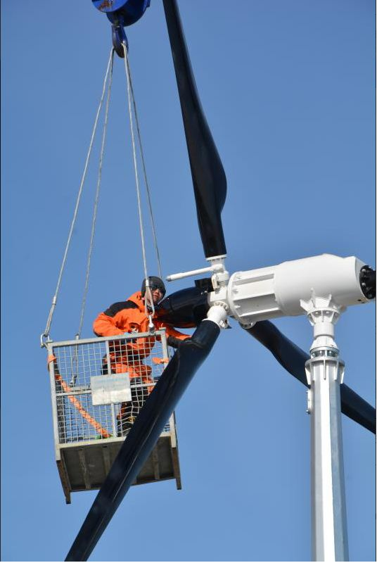 能源所需,使命必達(dá)。為保障南極恩克斯堡島新站電能源供給,為其“一站多能”的綜合觀監(jiān)測作用提供動力支撐,十八所依托能源系統(tǒng)設(shè)計(jì)和南極泰山站新能源系統(tǒng)建設(shè)經(jīng)驗(yàn),開展新站多能互補(bǔ)微電網(wǎng)系統(tǒng)建設(shè)項(xiàng)目的前期驗(yàn)證工作。面對時間緊、任務(wù)重的挑戰(zhàn),項(xiàng)目組成員呂冬翔博士充分發(fā)揮黨員先鋒模范作用,在極晝、強(qiáng)下降風(fēng)、強(qiáng)紫外線、淡水匱乏等惡劣條件下,他勇敢克服心理、生理上的影響,結(jié)合實(shí)地情況,開展風(fēng)力發(fā)電驗(yàn)證系統(tǒng)的安裝、調(diào)試工作,確保風(fēng)力發(fā)電集裝箱內(nèi)部系統(tǒng)運(yùn)行正常,并對太陽能發(fā)電裝置的機(jī)械結(jié)構(gòu)進(jìn)行特殊設(shè)計(jì),以整體框架式結(jié)構(gòu)保證太陽能發(fā)電裝置在大風(fēng)、低溫環(huán)境下正常工作。忙碌了近三個月的時間,終于圓滿完成任務(wù),為多能互補(bǔ)微電網(wǎng)系統(tǒng)成功建設(shè)奠定了基礎(chǔ)。