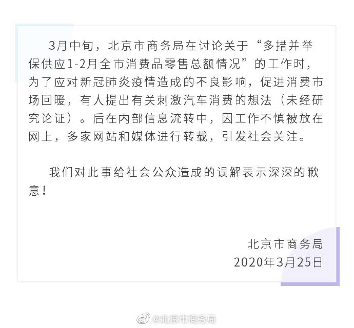 財聯(lián)社3月25日訊,據(jù)北京商務局官博消息,“北京有關(guān)刺激汽車消費措施”尚未研究論證,我們對此事給社會公眾造成的誤解表示深深的歉意。