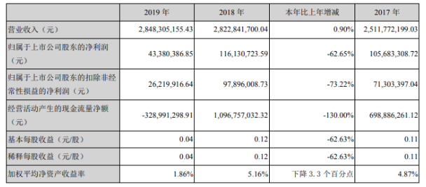 3月25日晚間,佛塑科技(000973)披露2019年年度報告,報告期內,公司實現(xiàn)營業(yè)收入28.48億元,同比上升0.9%;同期歸母凈利潤4338.04萬元,較上年大幅下降62.65%;扣非后歸母凈利潤則同比下降73.22%,至2621.99萬元。