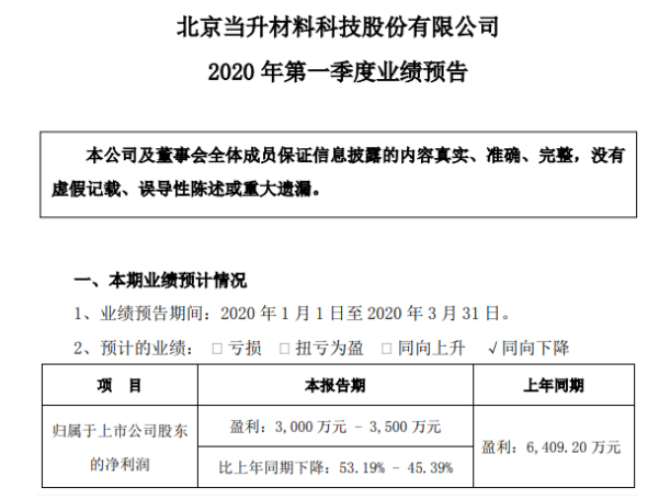 當升科技發(fā)布2020年第一季度業(yè)績預告,公司預計實現(xiàn)凈利潤3000-3500萬元,同比下降近一半。