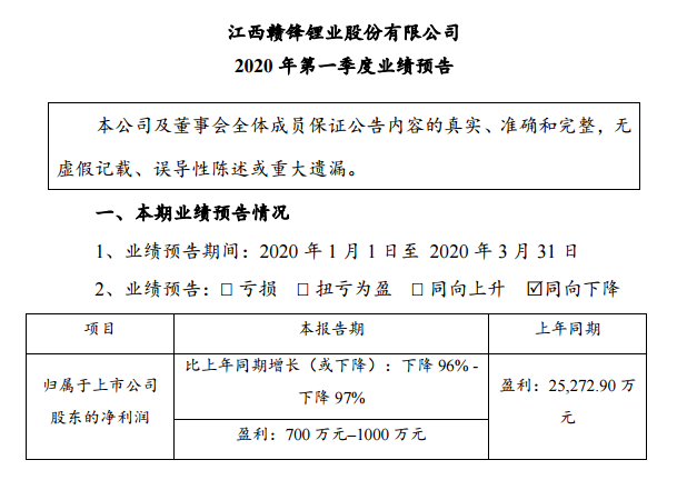 贛鋒鋰業(yè)昨晚發(fā)布了2020年一季度業(yè)績(jī)快報(bào),其歸屬于上市公司股東的凈利潤(rùn)預(yù)計(jì)為700萬(wàn)元–1000萬(wàn)元,同比下降96%-97%。