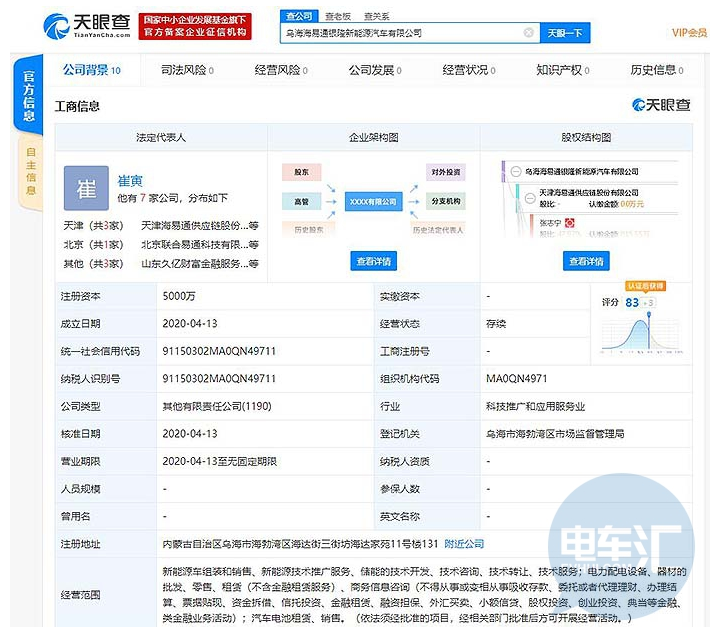 天眼查數(shù)據(jù)顯示,4月13日,烏海海易通銀隆新能源汽車有限公司注冊(cè)成立,該公司注冊(cè)資本5000萬(wàn),法定代表人為崔寅,公司經(jīng)營(yíng)范圍包括新能源車組裝和銷售、新能源技術(shù)推廣服務(wù)、儲(chǔ)能的技術(shù)開發(fā)、技術(shù)咨詢、技術(shù)轉(zhuǎn)讓、技術(shù)服務(wù)等,該公司共有兩大股東,分別為銀隆新能源的全資子公司——天津銀隆新能源有限公司和新三板掛牌公司海易通的運(yùn)營(yíng)主體——天津海易通供應(yīng)鏈股份有限公司。