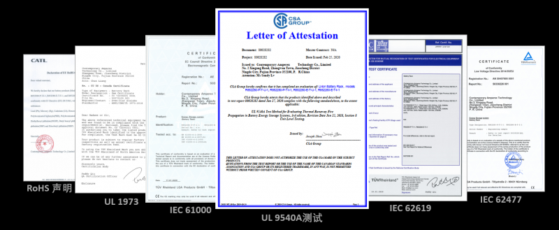 除了UL9540A,寧德時代還通過了GB/T36276,IEC62619,62477-1LVD,61000-6-2/-4EMC和UL1973等一系列國內(nèi)外權(quán)威認(rèn)證。我們積極參與國內(nèi)外高標(biāo)準(zhǔn)權(quán)威測試,在驗(yàn)證儲能產(chǎn)品安全的同時,保障儲能項(xiàng)目順利落地與安全運(yùn)行,促進(jìn)儲能行業(yè)健康發(fā)展。