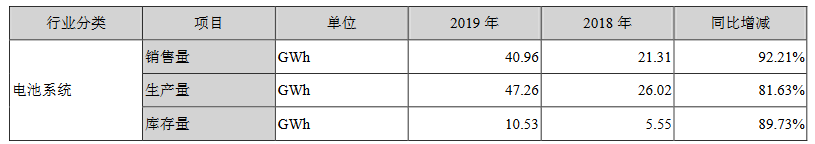 公告顯示,公司在2019年動力電池系統(tǒng)銷量40.25GWH,同比增長90.04%。