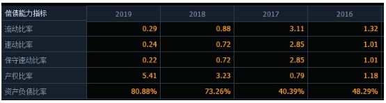 另外值得注意的是,截至2019年末,天齊鋰業(yè)負債總額達376.87億元。其中有息負債(短期借款+長期借款+應(yīng)付債券)31.91+122.55+20.71=175.17億元而同期貨幣資金僅為44.39億元。到了2020年一季報數(shù)據(jù)顯示,天齊鋰業(yè)資產(chǎn)負債率高達81.71%再次增加,公司的流動比率和速動比例分別為0.17和0.13,兩個數(shù)據(jù)雙雙低于0.2,公司違約風險非常高。