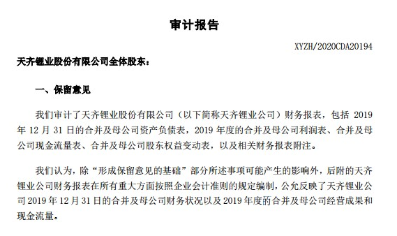 經(jīng)營業(yè)績的糟糕,直接的結(jié)果就是報表數(shù)字非常“難看”,而天齊鋰業(yè)2019年的財務(wù)報告更是被出具了保留意見+強調(diào)事項的審計報告。