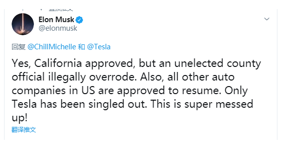 特斯拉CEO埃隆·馬斯克在社交媒體上的表態(tài)也證實了這一情況,馬斯克表示:“特斯拉今日將在違反加州阿拉米達縣的法令下重啟生產(chǎn),我將會與所有員工站在一線。若逮捕特斯拉的員工,希望逮捕的員工是我自己。”馬斯克還說:“加州已經(jīng)同意復工了,但一個未經(jīng)選舉的縣官員卻非法否決了。此外,美國所有其他汽車公司都獲準恢復生產(chǎn)。只有特斯拉被特殊對待。這太糟糕了!”