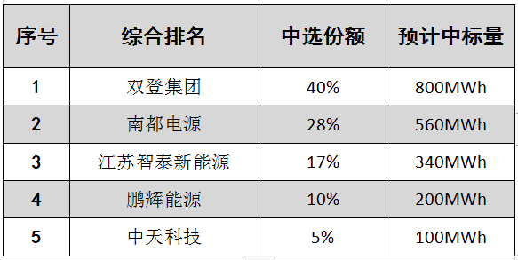 根據(jù)招標(biāo),本次采購周期為1年,采購規(guī)模的預(yù)估量為2.0GWh。招標(biāo)產(chǎn)品型號分為20Ah、50Ah、100Ah、150Ah、200Ah五大類。項(xiàng)目不劃分標(biāo)段,采用份額招標(biāo),中標(biāo)人數(shù)量為5家。具體中標(biāo)份額分配如下:
