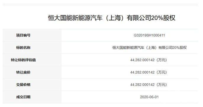 隨后,恒大國(guó)能新能源汽車(chē)(上海)有限公司在2019年11月正式更名為“恒大國(guó)能新能源汽車(chē)(上海)有限公司”。同年12月,恒大國(guó)能新能源汽車(chē)(上海)有限公司20%股權(quán)轉(zhuǎn)讓項(xiàng)目在上海聯(lián)合產(chǎn)權(quán)交易所官網(wǎng)掛牌轉(zhuǎn)讓,于今年6月1日正式成交。
