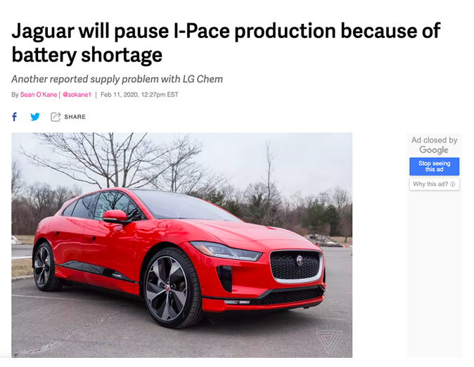 ▲外媒The Verge報道《捷豹I-Pace因LG動力電池供應(yīng)不足停產(chǎn)》