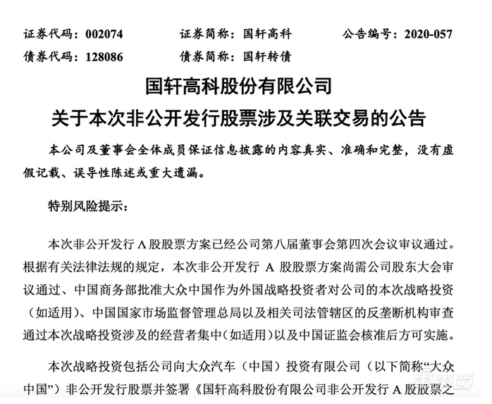 ▲國軒高科發(fā)布公告確定大眾入主