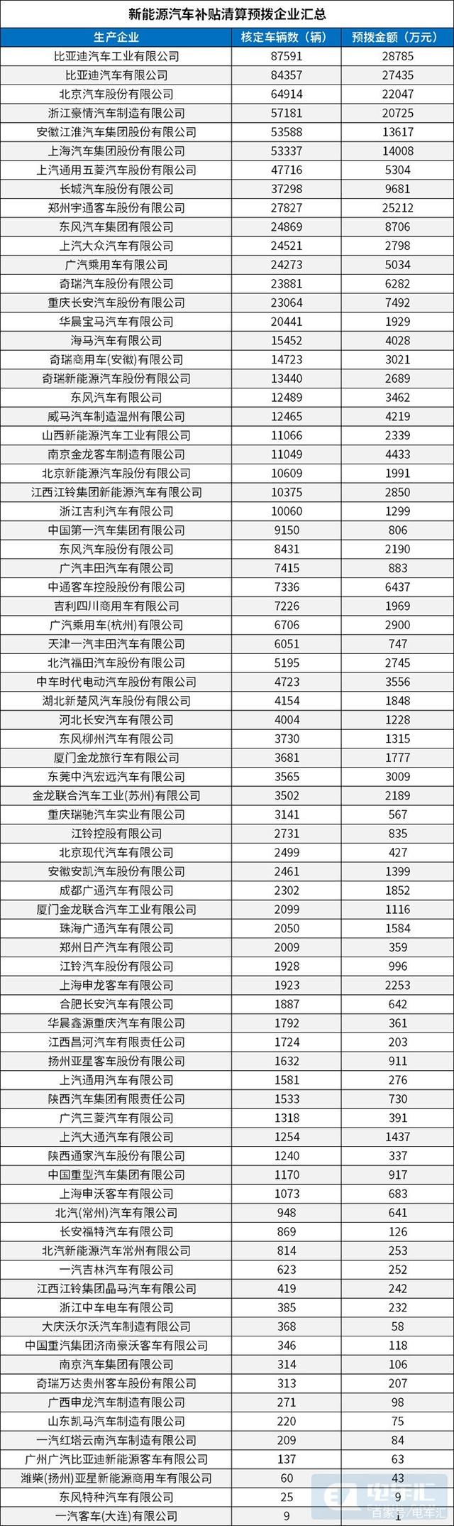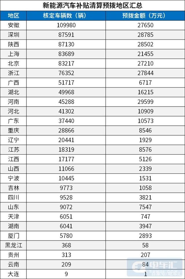 此次下達(dá)的2020年節(jié)能減排補(bǔ)助資金預(yù)算針對的就是此前完成銷售上牌的新能源汽車,補(bǔ)貼預(yù)撥付文件顯示,核定的車輛數(shù)為907132輛,本次撥付補(bǔ)貼資金28785萬元。核定推廣數(shù)量最多地區(qū)的是安徽,排名靠前的還有深圳、陜西、上海、北京,核定推廣數(shù)量最多的企業(yè)是比亞迪,其次是北汽、吉利、江淮、上汽。