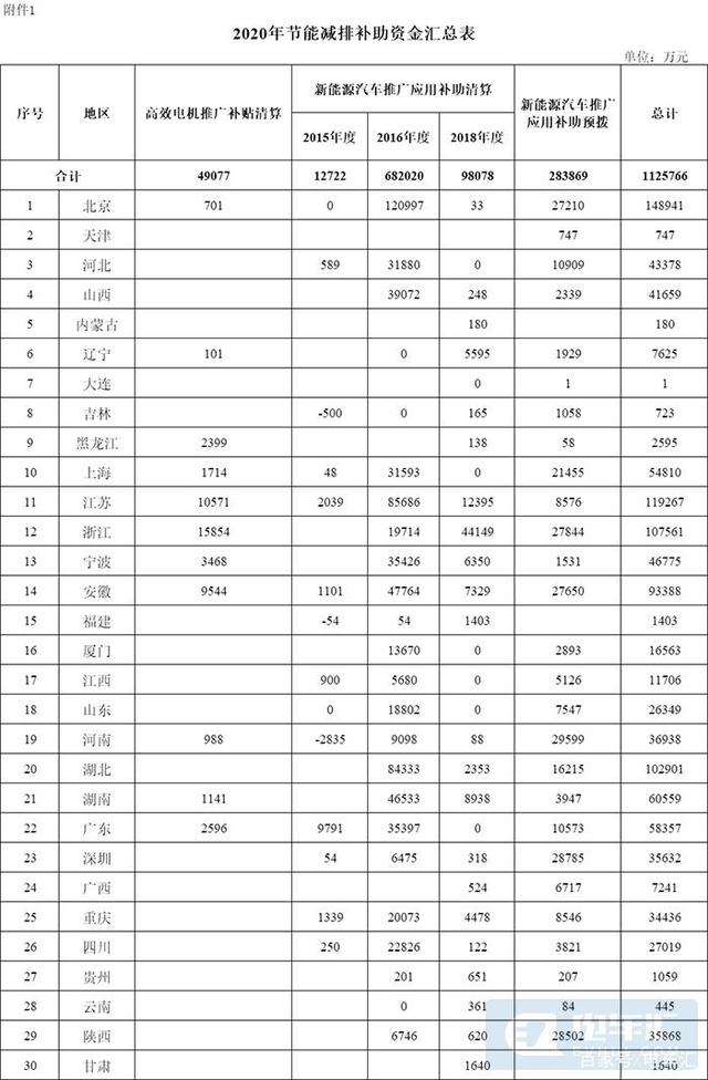 近日財政部發(fā)布了《關(guān)于下達(dá)2020年節(jié)能減排補(bǔ)助資金預(yù)算的通知》,其中包含各省市區(qū)的2015-2018年度新能源汽車購置補(bǔ)貼清算、新能源汽車購置補(bǔ)貼預(yù)撥。此次將下達(dá)2015年、2016年、2018年新能源汽車補(bǔ)貼資金共計107.67億元,另外,2018年度新能源汽車補(bǔ)貼將扣回229億元,本次扣減202億元,本次還將下發(fā)9.8億元。