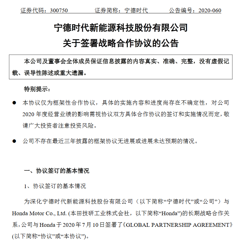 7月10日,寧德時(shí)代發(fā)布公告稱,為深化與Honda Motor Co., Ltd. (本田技研工業(yè)株式會(huì)社,下稱“Honda”)的長(zhǎng)期戰(zhàn)略合作關(guān)系,寧德時(shí)代與Honda于2020年7月10日簽署了《GLOBAL PARTNERSHIP AGREEMENT》(下稱“協(xié)議”)。