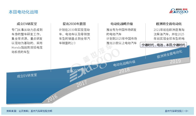 2018年,本田宣布將推出專為中國(guó)市場(chǎng)研發(fā)的電動(dòng)汽車,并計(jì)劃到2025年在中國(guó)市場(chǎng)推出20款以上的電動(dòng)汽車。與此同時(shí),為了應(yīng)對(duì)歐盟日益嚴(yán)苛的排放法規(guī),本田在2019年的日內(nèi)瓦車展上提出2025年歐洲全面電動(dòng)化戰(zhàn)略,屆時(shí)所售新車都將是純電動(dòng)或混合動(dòng)力車。