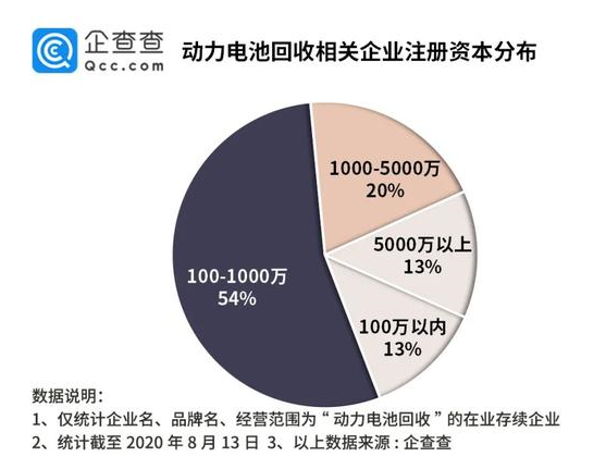 動力電池回收利用作為新興領(lǐng)域,目前處于起步階段,涉足次領(lǐng)域的公司大多實力雄厚。從注冊資本上看,動力電池回收相關(guān)企業(yè)注冊資本大多位于100-1000萬之間,注冊資本在100萬以內(nèi)的企業(yè)僅有13%,而注冊資本在5000萬以上的企業(yè)也占據(jù)了13%。