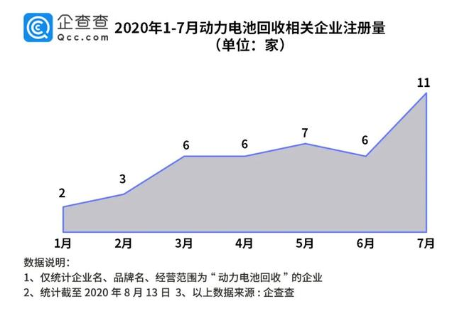 據(jù)中國汽車技術(shù)研究中心數(shù)據(jù)顯示,2020年國內(nèi)累計退役的動力電池將超過20萬噸,動力電池退役潮鄰近,市場加快了部署動力電池回收循環(huán)利用的步伐。今年1-7月動力電池相關(guān)企業(yè)注冊量達(dá)41家,較2019年同期上升了71%,分?jǐn)偟矫總€月來看,2020年7月企業(yè)相關(guān)企業(yè)注冊量達(dá)11家,較6月環(huán)比上升了83%。