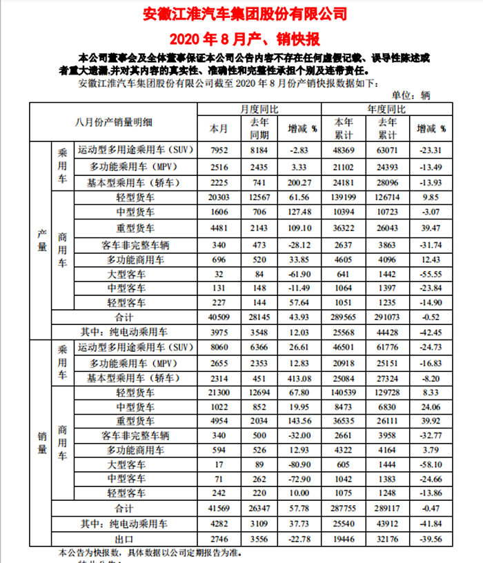 其中,純電動乘用車8月的產(chǎn)銷分別為3975輛和4282輛,同比增長12.03%和37.73%;前八個月江淮汽車純電動乘用車累計實現(xiàn)產(chǎn)銷分別為25568輛和25540輛,分別同比下降42.45%和41.84%。