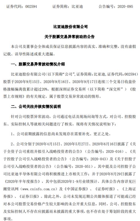 比亞迪:近期生產(chǎn)經(jīng)營(yíng)正常經(jīng)營(yíng)環(huán)境未發(fā)現(xiàn)重大變化