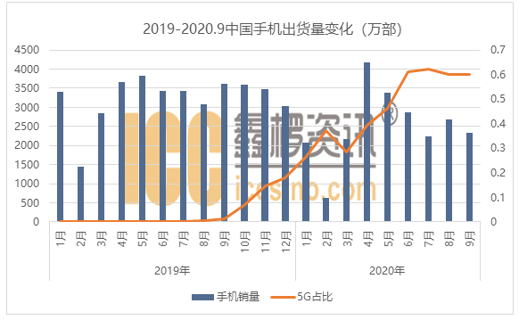 據(jù)中國(guó)信通院數(shù)據(jù),2020年9月,國(guó)內(nèi)手機(jī)市場(chǎng)總體出貨量2333.4萬部,同比下降35.6%;國(guó)內(nèi)市場(chǎng)5G手機(jī)出貨量1399萬部,占同期手機(jī)出貨量的60.0%。1-9月,國(guó)內(nèi)手機(jī)市場(chǎng)總體出貨量累計(jì)2.26億部,同比下降21.5%。