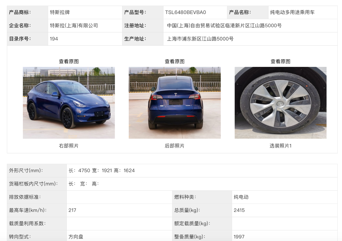 11月5日,工信部發(fā)布《道路機動車輛生產(chǎn)企業(yè)及產(chǎn)品公告》(第338批)的車輛新產(chǎn)品公示清單顯示,國產(chǎn)特斯拉Model Y已完成工信部申報,電池類型為三元鋰離子電池。