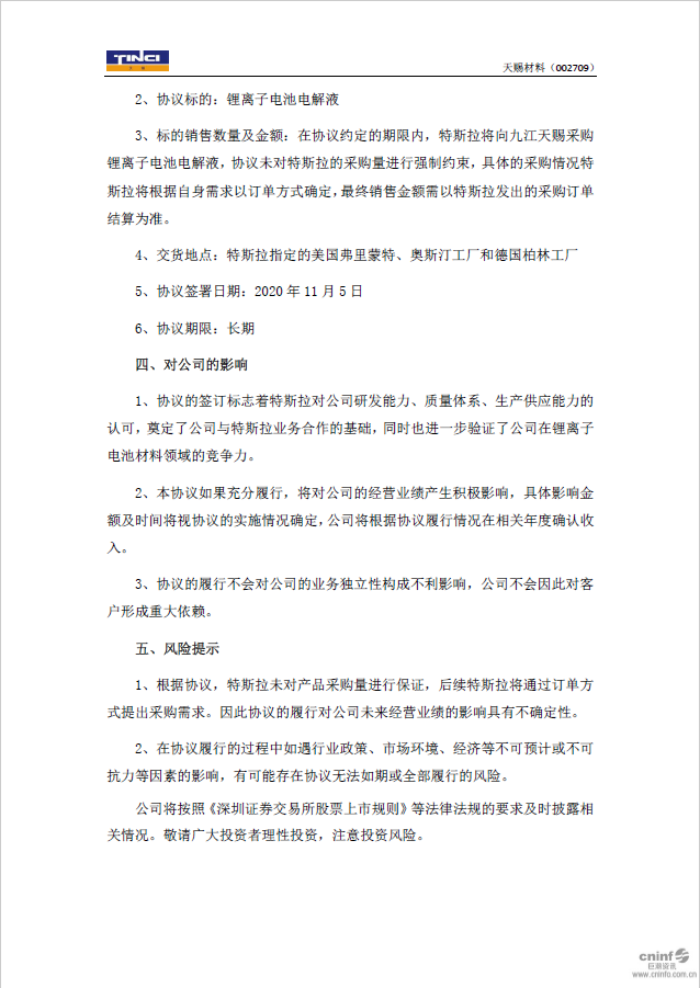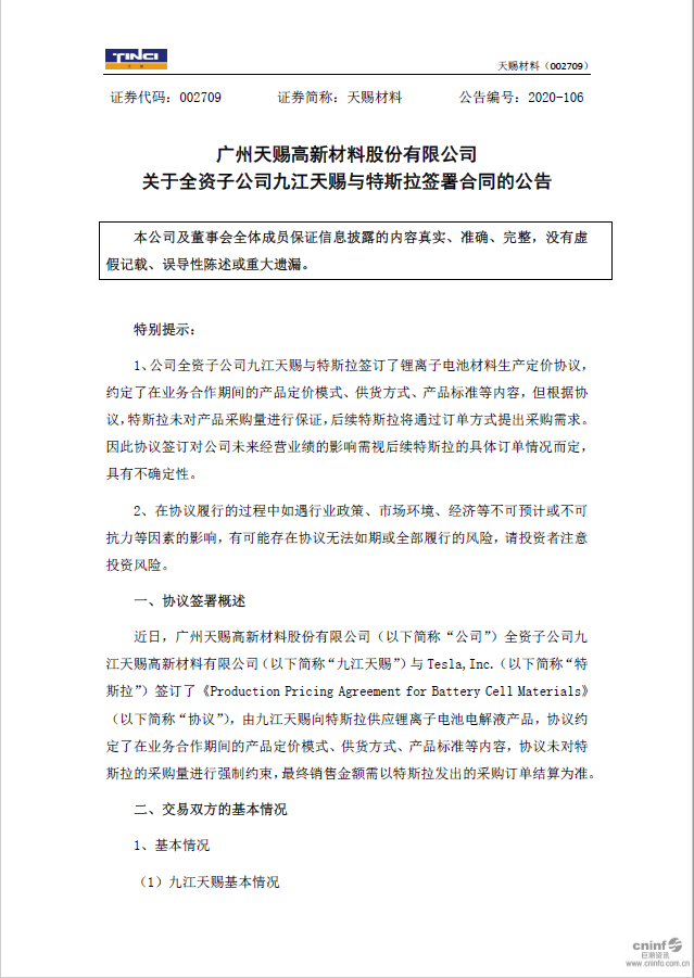 天賜材料:關(guān)于全資子公司九江天賜與特斯拉簽署合同的公告