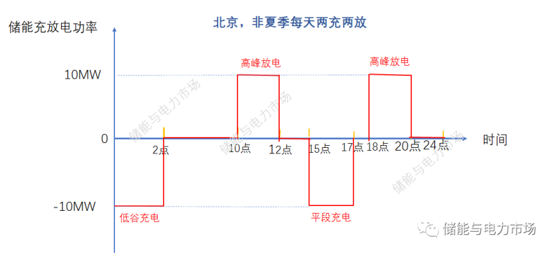 非夏季,每天低谷0-2點,平段15-17點各充電2小時,總計充電4小時。每天高峰10-13點,18-20點各放電2小時,總計放電4小時。